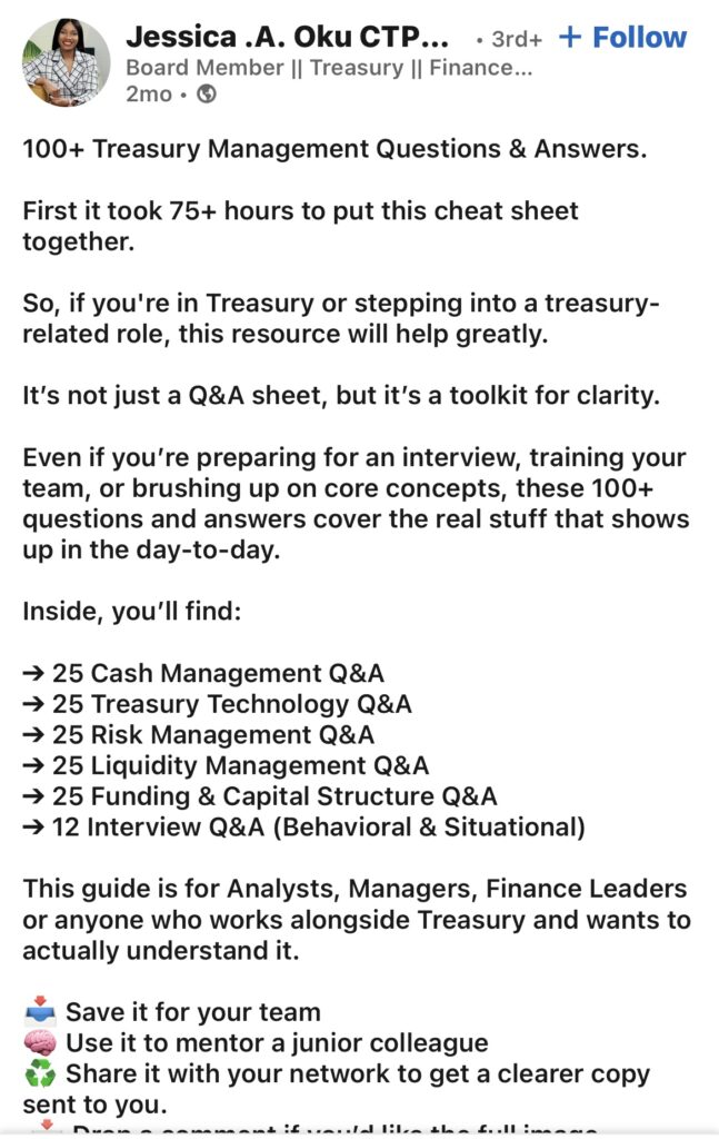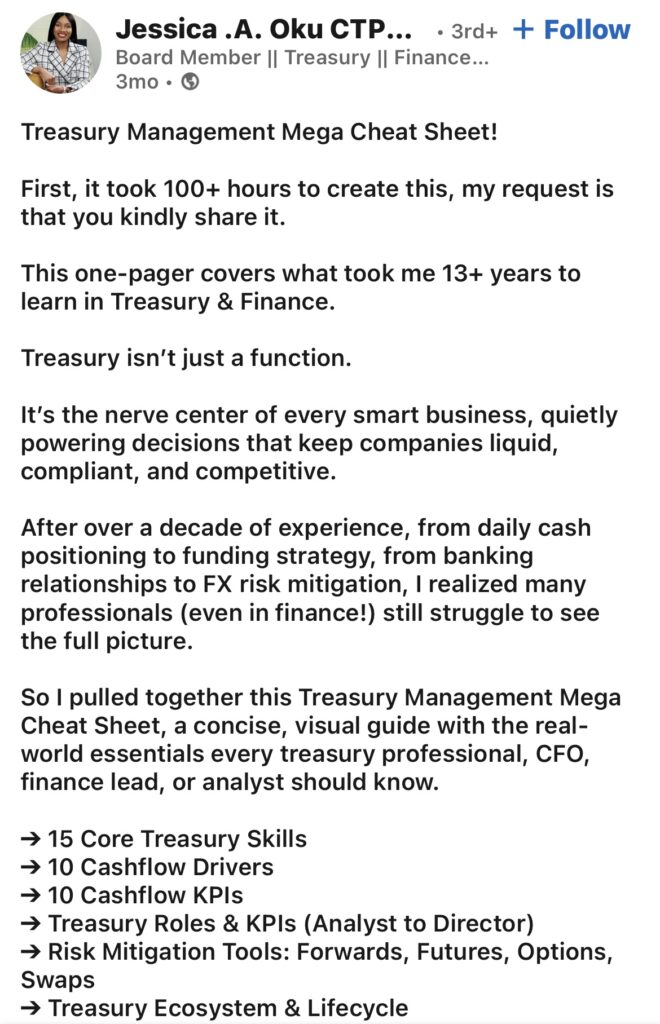 This program is exclusively for senior Treasury and Finance professionals like CFOs, Treasurers, Finance Directors, and seasoned leaders who want to build visibility, influence, and legacy on LinkedIn without compromising their packed schedules.