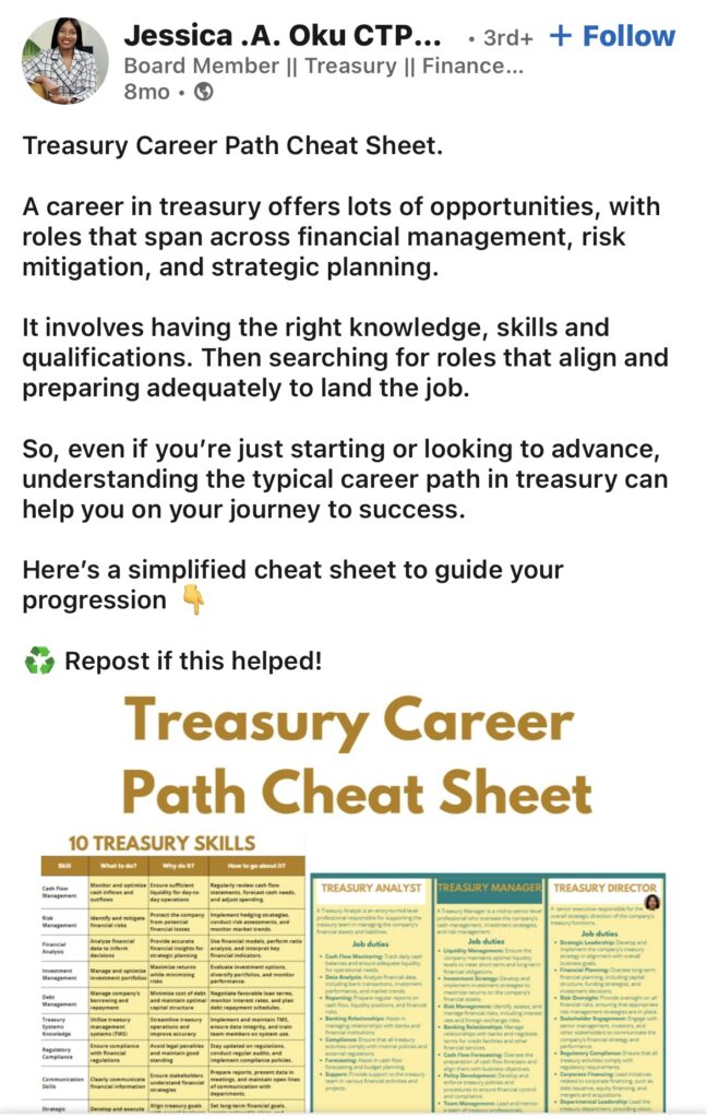 – More invitations to speak at treasury and finance panels because they’ve been following your content