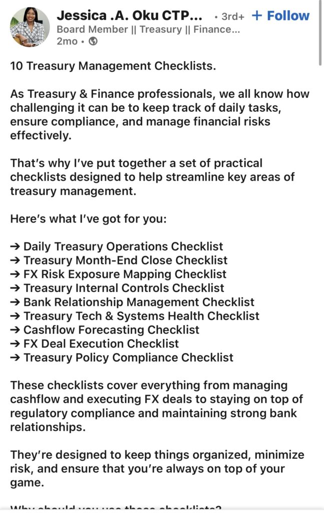I am also a Treasury & Finance Thought Leader, Coach, Founder, Author of The Cashflow Prioritization Matrix™ book, Speaker, and anchor of 🎙️Cashflow Code Podcast & 🎙️ Scale Treasury Podcast. Currently on the Treasury Masterminds Board, an Expert Contributor for TreasuryXL and advisor to Startups.