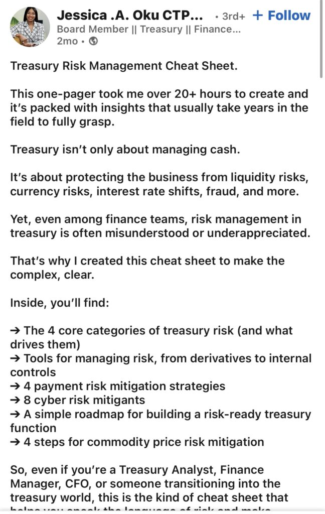 It's a pleasure to connect with you on LinkedIn. I have been following you for a while and I find your regular posts on treasury management very insightful. Looking forward to stay connected and engage on treasury related subject.